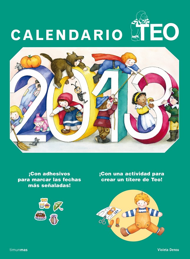 El calendario Teo ayuda al niño a aprender los días de la semana, los meses del año y las estaciones a la vez que se divierte. Gracias a los adhesivos que se encuentran al fi nal de sus páginas, el niño puede marcar las fechas que desea recordar, así como señalar los días que llueve, hace sol o está nublado. También aprenderá las fases de la luna y podrá realizar actividades que el propio Teo propone. Este año incluye ¡una divertida actividad para construir una marioneta de Teo!