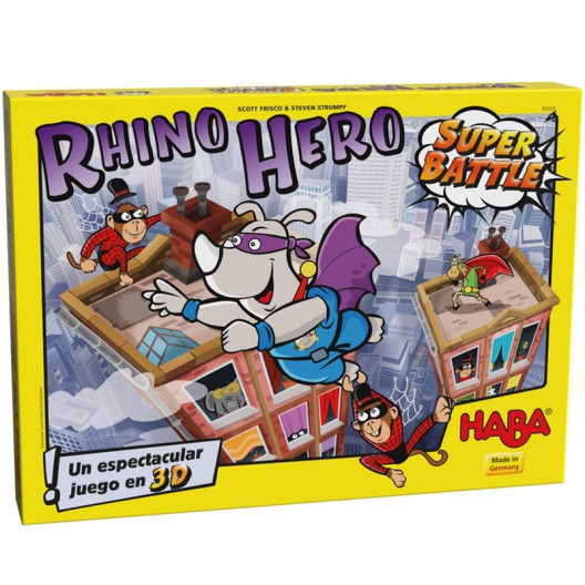 Rhino Hero y sus amigos superhéroes viven infinidad de aventuras en el rascacielos de cartas. Pero, cuidado, porque el rascacielos es cada vez más alto e inestable a medida que se le van añadiendo cartas. El que tire el dado con habilidad, mueve a sus superhéroes hacia arriba y defiende su lugar en las batallas contra otros jugadores... si no fuese por los monos-araña, que hacen tambalear el rascacielos.