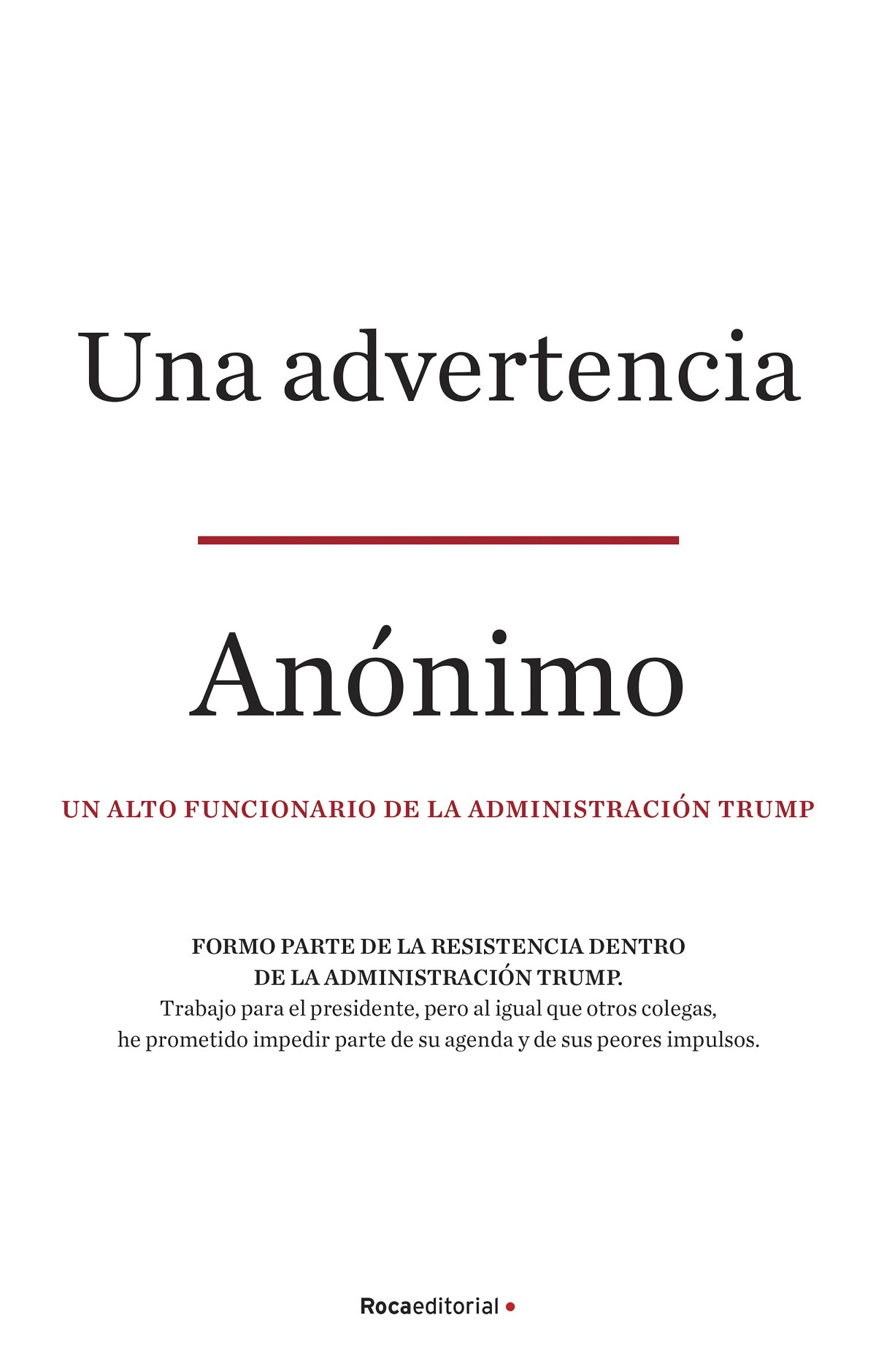 MÁS DE 350.000 EJEMPLARES VENDIDOS EN ESTADOS UNIDOS.EL LIBRO POLÍTICO DEL QUE TODO EL MUNDO HABLA.Un retrato sin precedentes de lo que sucede dentro de la administración de Donald Trump por parte de un alto funcionario anónimo de la Casa Blanca, cuyas primeras palabras de advertencia sobre el presi...