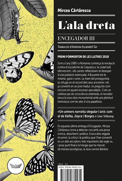 Som a l’any 1989 i a Romania comença la revolució contra el socialisme de Ceau?escu: la ciutat bull, efervescent, i els carrers reflecteixen el desesper d’una població extenuada. A Bucarest tot és misèria, gana i runes. La mare del protagonista es refugia en el record dels seus ancestres i ell, ja convertit en un jove madur, es pregunta com escriure en aquest escenari apocalíptic. Com un calidoscopi de consciència esberlada, el narrador tanca la seva obra monumental amb una plenitud tremolosa com les ales d’una papallona.