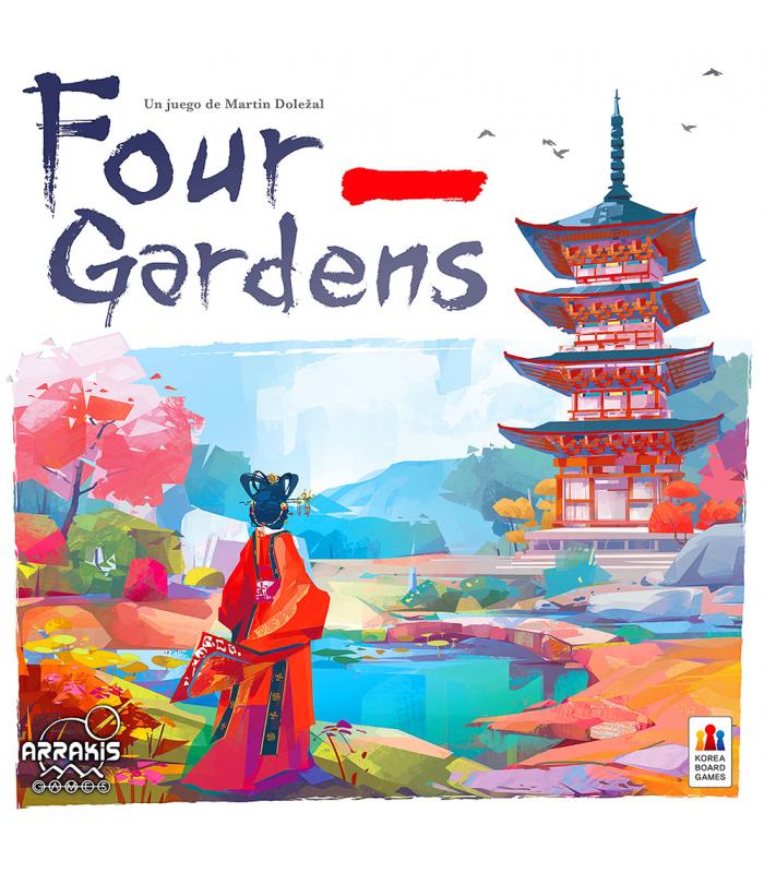 El objetivo en Four Gardens es ser quien acumule más puntos de victoria completando cartas de Paisaje y haciendo conjuntos con ellas. Estos conjuntos se llaman panoramas y crean una vista panorámica de tu jardín. Tu puntuación al final de la partida será el total de benevolencia que hayas conseguido de cada uno de los 4 Dioses (indicado por tu posición en los cuatro marcadores de Dioses del tablero de puntuación) además del valor de cualquier recompensa extra ganada al finalizar un conjunto. La benevolencia se gana al completar las cartas de Paisaje. Para ello debes jugar cartas de Proyecto, adquirir recursos y asignar dichos recursos para cumplir los requisitos de cada carta de Proyecto. Los recursos se consiguen mediante una mecánica innovadora que emplea una espectacular pagoda modular para saber qué recursos obtendrá cada jugador al girar los diferentes pisos de la pagoda.